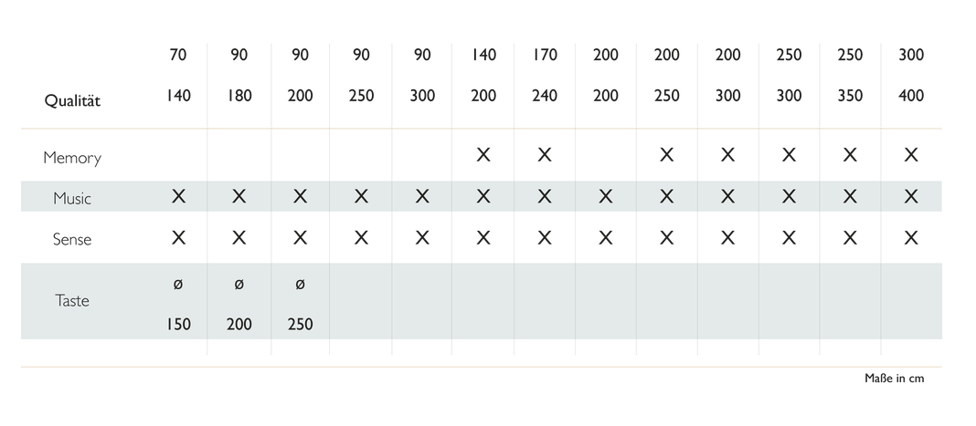 Die Möglichkeit einer Sondermaßanfertigung ist in der Breite von 50-600cm (Music und Sense), sowie 70-400cm (Taste) möglich. Es kann jede gewünschte Sonderlänge angefertigt werden. (Ausnahme Memory)