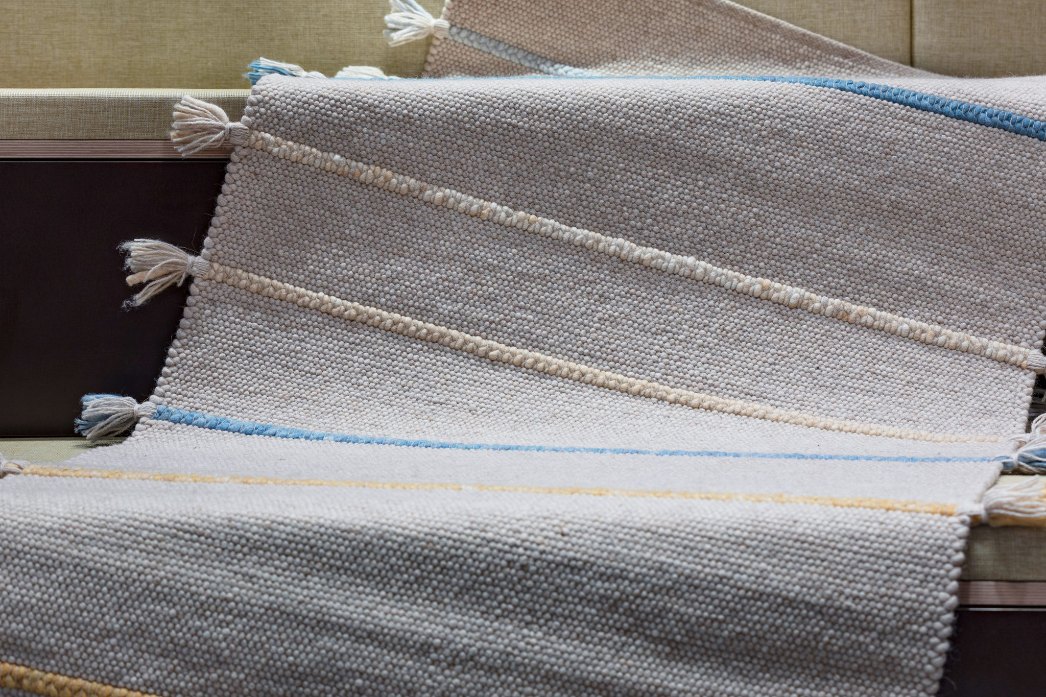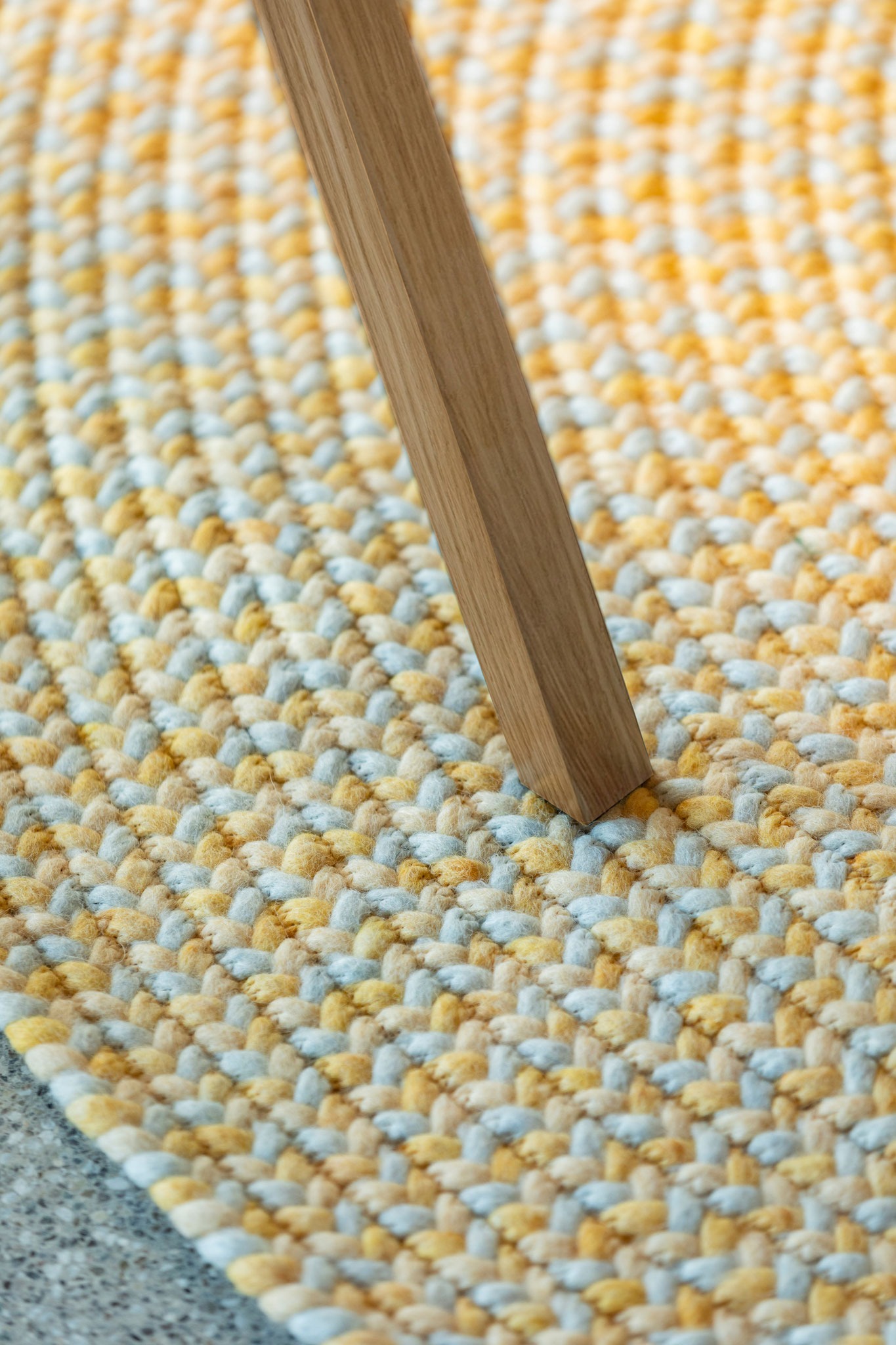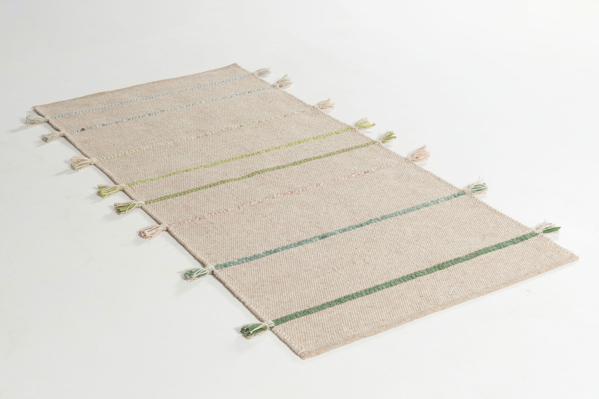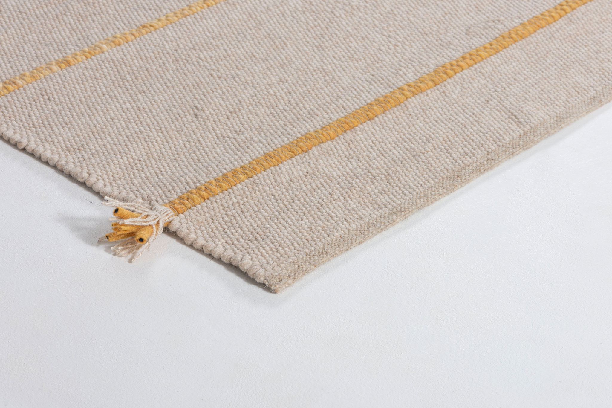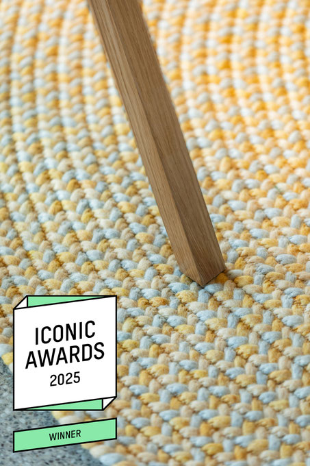 Jede Jahreszeit hat ihren eigenen Klang und einen Rythmus in dem sich die Natur verändert – der Teppich "Music" gibt in fein dosierten, handgeflochtenen Zöpfen in der Kombination mit der ruhigen Webstruktur genau diesen wieder. Die offenen Enden stehen für die Unanhängigkeit der Natur und verleihen dem Teppich eine lockere Anmutung.