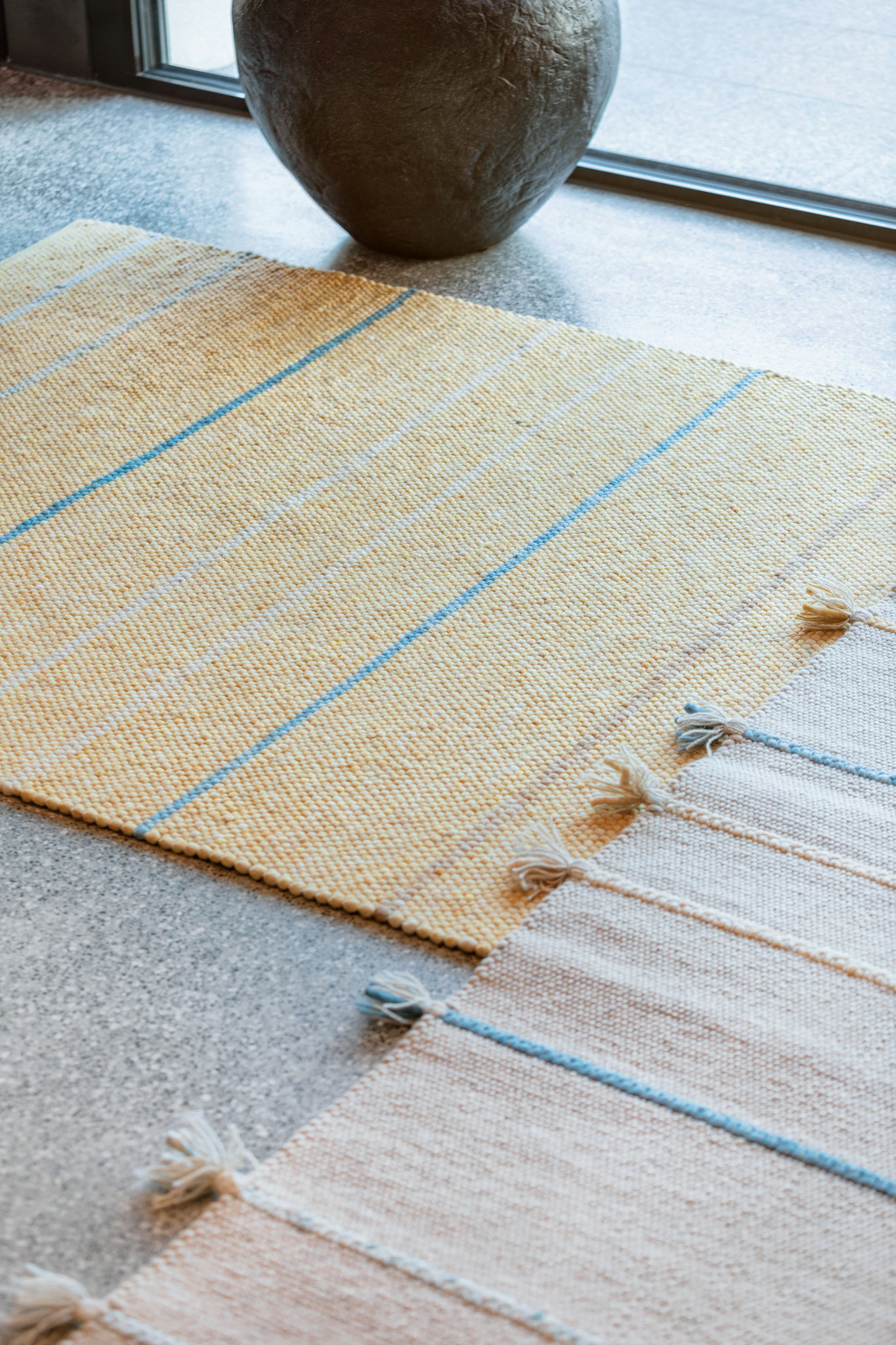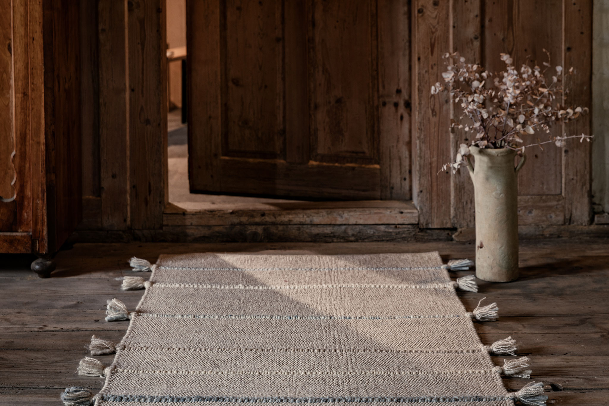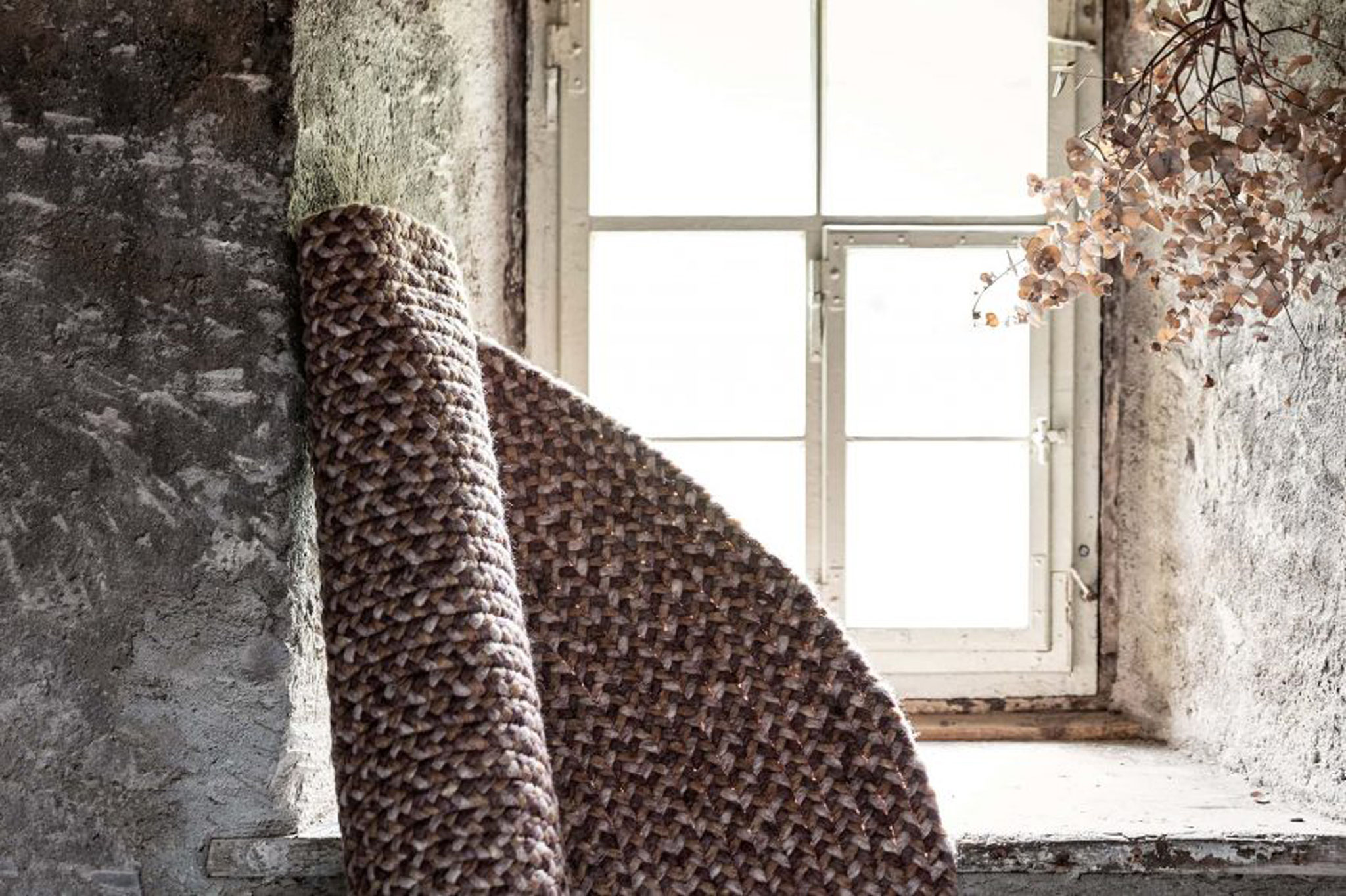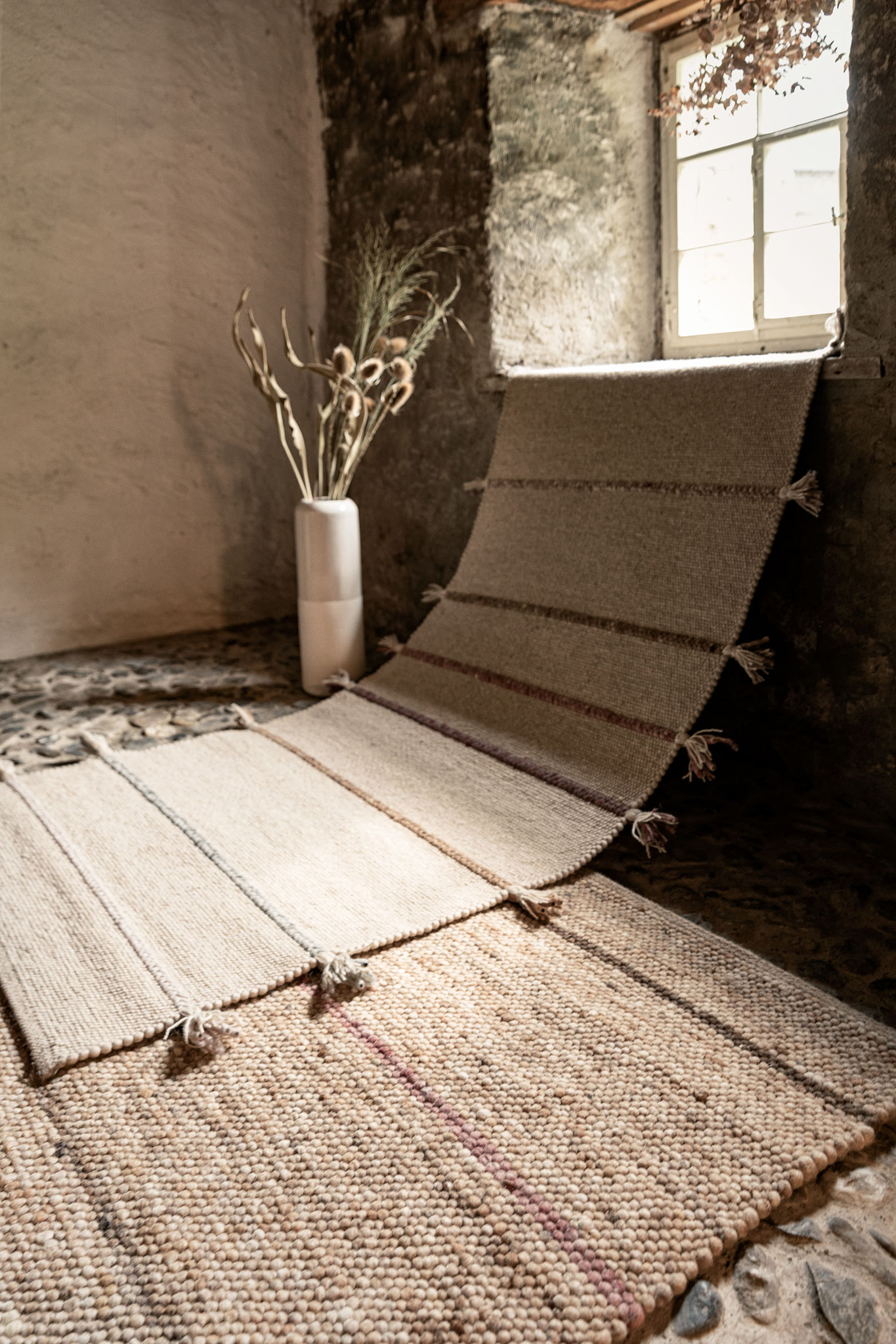 Jede Jahreszeit hat ihren eigenen Klang und einen Rythmus in dem sich die Natur verändert – der Teppich "Music" gibt in fein dosierten, handgeflochtenen Zöpfen in der Kombination mit der ruhigen Webstruktur genau diesen wieder. Die offenen Enden stehen für die Unanhängigkeit der Natur und verleihen dem Teppich eine lockere Anmutung.