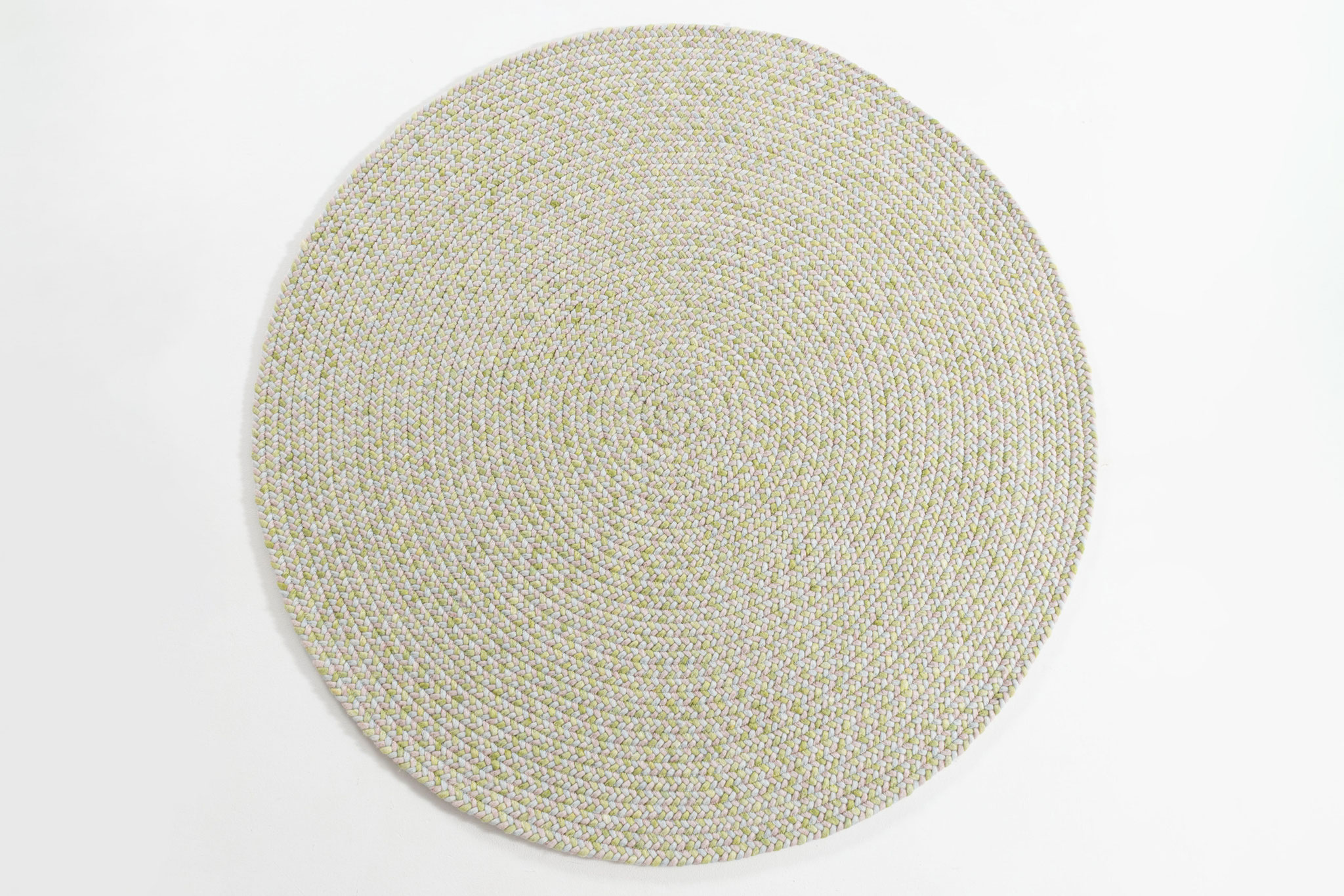 Die vier Jahreszeiten erlebt man mit allen Sinnen– doch wie schmecken Frühling, Sommer, Herbst und Winter? Mit dieser Frage beschäftigt sich der vierte Teppich "Taste" in der Kollektion "Four Seasons". Die verschiedenen Farbspiele aus jeweils drei Farben werden zu Zöpfen geflochten und in einem runden Teppich zu einer Fläche vernäht.